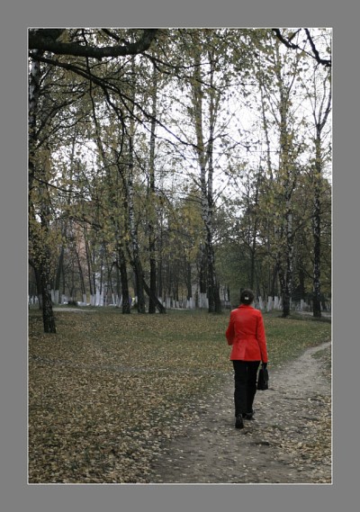 Смотришь на картинку, и видишь не осень, а опаздывающую на автобус тетку в красной куртке. Первая реакция от картинки - именно такая. Обычный случайный любительский снимок. 10x15, глянцевая. Не, не понравилась.
