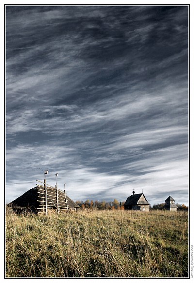 ОК фотка быть может и ничего в смысле цвета, да осень есть. Но присмотримси ближе и видим что к сожалению строения здеся не воспринимаются зрителем так как сарай и церквушки находятся в разных третях (и при ентом равны по весу)и тем самым уравновешивают друг друга в результате мы видим просто поле между домами к которому нас давит небо и потом взгляд начинает в лихорадке рассматривать то лево то право, так ничего и не поняв %) не каждый зритель остановиться у такой надолго, «со всеми посл =)»