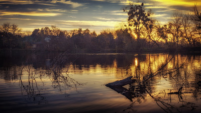 Качественная фотография с красивым вечерним небом, насыщенным рисунками облаков, с мягким светом заката, с отражениями на воде с небольшим волнением. Очень хорошо получилось! И один вопрос: а вот там на дереве на заднем плане не гнёзда ли птиц?