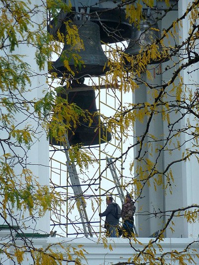 "Первоначально колокольный звон по звуку и технологии отличался от появившейся позднее русской православной традиции. Звонарь епархии Игорь Архипов пояснил: «Раскачивался сам колокол, это назывался «очипный звон». Сейчас до сих пор на Западе так звонят, то есть раскачивают не язык, а колокол. Колокол выполнял несколько функций. Он собирал верующих к молитве, на службу. Ну и сам — это молитва, обращенная к Богу». Псковско-Печерская лавра была, пожалуй, единственным местом в России, где по-прежнему звонили, раскачивая сам колокол. В основном же преобладала русская традиция звонов, когда звук извлекается раскачиванием языка инструмента. "