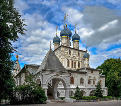 Храм иконы Казанской Божией Матери в Коломенском В 1649 году в связи с рождением наследника престола Дмитрия Алексеевича было установлено общецерковное почитание Казанской иконы Божией Матери. Тогда же были заложены каменные Казанские церкви в ярославском Казанском монастыре и при царском Коломенском дворце. Строительство существующего в Коломенском кирпичного здания на высоком подклете с шатровой колокольней было завершено за четыре года. Эта кирпичная пятиглавая церковь, украшенная шатровой колокольней, дошла до наших дней почти без изменений. Есть сведения, что под крестом её центральной главы имелась надпись, гласящая, что церковь Казанской иконы Божией Матери возведена на месте находившегося здесь прежде деревянного храма в честь столетия взятия Казани. Новый храм в селе Коломенском выполнял роль домовой церкви при государевом дворце. Когда строительство завершилось, храм убрали с роскошью, соответствующей его статусу. Как один из элементов комплекса царского дворца, он был украшен богатой росписью, дорогими тканями и коврами. Пол центральной части храма и его пределов утеплили войлоком. Архитектурный стиль-Русское узорочье |