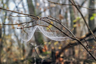 Последний аккорд осени На ветке паутинка, как крылья бабочки, осенним утром когда туман рассеялся, с капельками воды, паутинка бугорком на ветке, крупным планом.Развешена на ветке.. При рассеянном утреннем свете. В лесу утром.. |