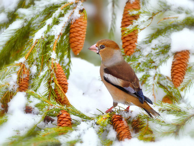 Зарисовка из зимнего леса 2 Дубонос. С очень массивным голубовато-серым (зимой палевым) клювом, приспособленным для щелканья косточек плодов и ягод: вишни, черешни, черемухи. Особым лакомством будут кедровые орешки. Дубоносы в случае нападения защищаются укусами клюва, которым могут сдавливать с силой более 45 кг. |