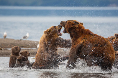 Защищая детей Камчатка. Южно-Камчатский заказник имени Т.И Шпиленка Курильское озеро. Медведица отгоняет самца, который приблизился к медвежатам с явно не добрыми намерениями. Фототуры по Камчатке 2020 www.kamphototour.com/phototours/ |