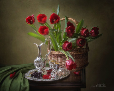 С корзиной красных тюльпанов