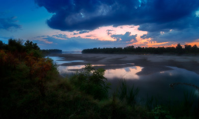 отсветы неба на реке , несколько кустов бузины с увядающими листьями .