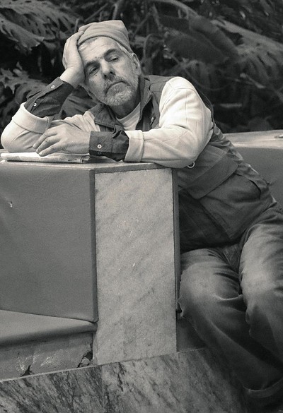 Аида, я ожидал подобный вопрос и спасибо, что задали. Немного деталей: это охранник на выставке фотографии в публичной библиотеке. Не могу точно утверждать, на кого он поднял веки, но у меня было такое ощущение, что он просто и откровенно дремал...
