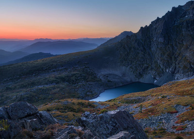 Синее око Второе озеро Красной горы, Усть-Коксинский район, Республика Алтай. Конец августа здесь уже ощущается как середина сентября, если смотреть на краски кустарников, покрывающих склоны - и это довольно интересно, ведь Красная гора невысока - всего-то 2471м. При этом здесь, несмотря на жару, даже в конце лета все еще лежат небольшие снежники. |