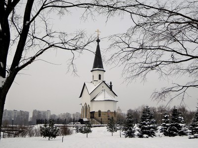 Верх сооружения гармонирует со снежным покровом, слегка выбивает лишь задний фон.