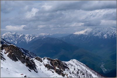 Sergey 48, Сергей, точно не могу сказать. Снимал с перевалочного пункта. Справа, внизу Олимпийский объект Роза хутор. Оттуда идёт канатная дорога (видна в левом, нижнем углу.)