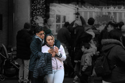 Пара у праздничной витрины универмага Macy's в Нью-Йорке
