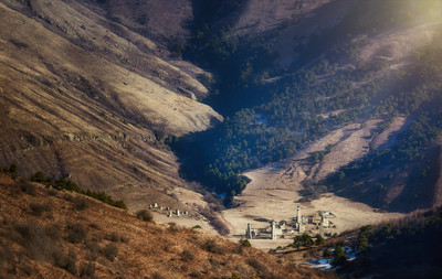Таргим Ингушетия. Башенный комплекс Таргим, вид с перевала Цей Лоам. "Архитектурный комплекс «Таргим», представлен множеством исторических объектов: древние жилища башенного типа, 4 боевые башни, 4 — полу боевые и 16 полуразрушенных жилых башен, а также 19 склеповых могильников, 2 мавзолея и 5 cвятилищ. В настоящее время данные объекты ингушской архитектуры и вся территория поселения входят в Джейрахско-Ассинский государственный историко-архитектурный и природный музей-заповедник и находятся под охраной государства." |