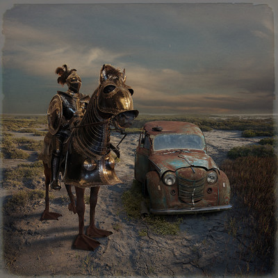 Автор опровергает вечную мысль - железная лошадка идет на смену... Не, не идет. Тут, значит, метафора. Лицо лошади и лицо машины говорят нам - ох и заииипали вы нас. Лицо лыцаря скрывает мордозащита, но зрителю и так понятно - лыцарь - де-бил с тазом на боку и перьями в голове. И его тоже заииипали. То мельницы, то прынцесс спасай от драконов - дело кислое. Потому потерял свое длинючее копье и вообще потерял навигацию. Лошадь не один раз преодолевала водяные рвы, оттого мутировала в нужный девайс вместо копыт. И по пустыне легче проходимость. А лошадь думает - эх, искупаться бы сейчас... во рву. Лыцарь думает - если она, лошадь, опять полезет в ров купацца, я весь заржавею, как та машина. (автор показывает нам дуализм) Машинка, грустя фарами, думает - да что вы знаете о Париж-Дакаре? Тем более, когда спи...ли дворники и антенну музыки. Полотно зачетное, Женя, Алекс, Эбер - надо рекомендовать! |