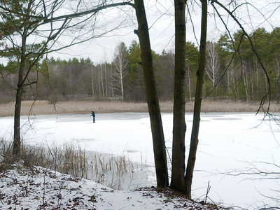 Замерзшее озеро в лесу и человек на льду