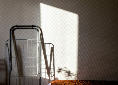 Игра весенних лучей на струнах сушилки для белья в спальной комнате.