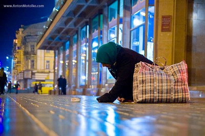 Киевские будни... Хрещатик. Одинокая старушка сидела на дороге и просила милостыню... а напротив светились огни бутиков, мимо проезжали бентли и гуляли Киевляне в тот теплый осенний вечер... |