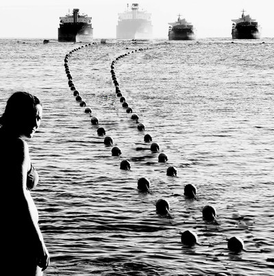 головы участников массового заплыва и муза- стартер:)