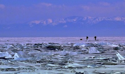 При помощи зума приближен противоположный берег Байкала (в Бурятии) с берега окончания посёлка Листвянка. Расстояние между двумя берегами 22 км.