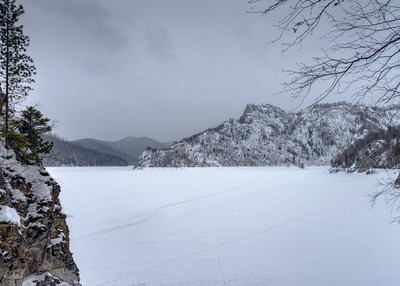Не везет мне на солнечные дни! Вот и снова пасмурный день 8 марта со снежком, а мы на Бирюсе. Вид из Царских ворот на Козыреевский зуб, самую высокую точку этого района.