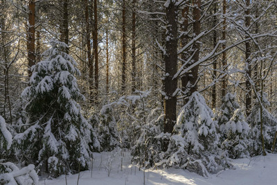 Прогулка по лесу в утренние часы. В ветвях деревьев запутались лучи солнца.