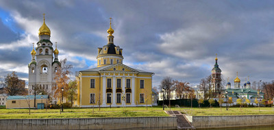 Ансамбль старообрядческих храмов у Рогожской заставы (в Рогожской слободе) Слева на право, Церковь Успения Пресвятой Богородицы в колокольне, Кафедральный собор Покрова Пресвятой Богородицы, Церковь Николая Чудотворца. |