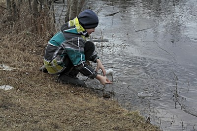Мальчик играющий льдинкой.