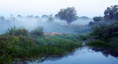 Летний утренний туман в поле у озера.