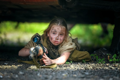 Love the concept, and a well executed image. Posing is balanced and realistic. The facial expression is a bit too relaxed. In a stress situation I would envision a more pinched look with squinted eyes. Just a thought to improve an already good photo.