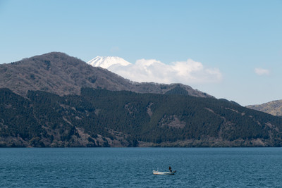 Рыбалка на озере Аси с видом на гору Фудзи.