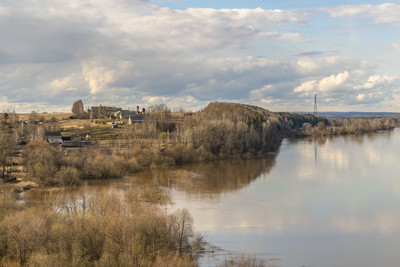 Весенний разлив Вятки, на высоком берегу приютилась маленькая деревенька