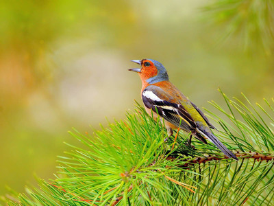 В весеннем лесу Зяблик. Это одна из самых нарядных птиц. В ее окрасе есть коричневые, голубые, серые, белые, красные, черные и зеленые цвета. На крыльях у самцов яркая белая полоска, а голову украшает голубая шапочка. Для зяблика пение является очень важной частью его птичьей жизни. Бывают случаи, когда вокалисты поют настолько самозабвенно, что забывают обо всех опасностях, подстерегающих их вокруг. Хотя обычно эти певцы осторожны и боязливы, поэтому их так трудно поймать. Зяблики прекрасно летают, но большую часть времени предпочитают передвигаться по земле мелкими шагами или прыжками. |