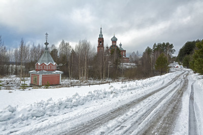 зима, Селигер, Ширков Погост, на дальнем плане церковь Рождества Иоанна Предтечи