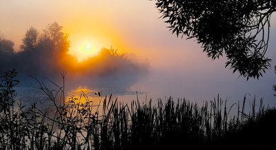 Туманное утро сентября на озере Сосновое. Юго-восток Московской области.