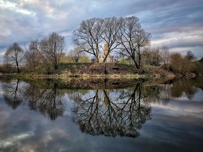 За деревьями видна церковь Знамения Пресвятой Богородицы в Дубровицах. К сожалению в этот день с собой был только телефон.
