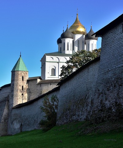 Псковский Кром Начальное поселение в мысовой части городища датируется серединой первого тысячелетия. В X—XII веках здесь существовали земляные, а позже каменные укрепления, и деревянный Троицкий собор. В период Псковской республики, XIV — начало XVI веков. Кремль с его собором, вечевой площадью и кромскими клетями был духовным, юридическим и административным центром псковской земли. |