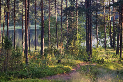 Великолепно река или озеро за соснами просматривается!