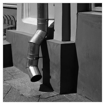 Эта водосточная труба просто стесняется. Дождя нет, а она тут место занимает. Комплексы, заниженная самооценка... новая (молодая) еще. С первым ливнем пройдет!