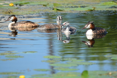 Июль. Семейство чомги на деревенском пруду.