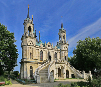 Церковь Владимирской иконы Божией Матери в Быково Церковь Владимирской иконы Божией Матери — знаменитый памятник русской псевдоготики XVIII века в селе Быково Церковь построена в 1789 году в псевдоготическом стиле на территории усадьбы Воронцова-Дашкова, в то время принадлежавшей Михаилу Измайлову. По стилистическим особенностям проект приписывается Василию Баженову. Храм имеет два этажа. Снаружи церковь облицована белым камнем. При Владимирской церкви возвели две колокольни - одну под звон (на ней повесили семь колоколов), вторую - под часы, водрузить которые так в итоге и не получилось В 1830-х годах рядом с церковью построена отдельно стоящая колокольня, выдержанная в том же стиле, что и храм. В 1930-х годах церковь была закрыта , там разместили швейную фабрику, а позднее склад. Возвращена РПЦ в 1989 году. |