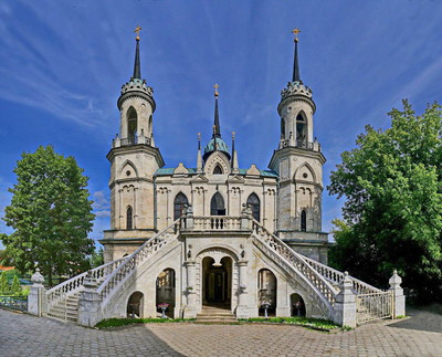 Церковь Владимирской иконы Божией Матери в Быково Церковь Владимирской иконы Божией Матери — знаменитый памятник русской псевдоготики XVIII века в селе Быково Церковь построена в 1789 году в псевдоготическом стиле на территории усадьбы Воронцова-Дашкова, в то время принадлежавшей Михаилу Измайлову. По стилистическим особенностям проект приписывается Василию Баженову. Храм имеет два этажа. Снаружи церковь облицована белым камнем. При Владимирской церкви возвели две колокольни - одну под звон (на ней повесили семь колоколов), вторую - под часы, водрузить которые так в итоге и не получилось В 1830-х годах рядом с церковью построена отдельно стоящая колокольня, выдержанная в том же стиле, что и храм. В 1930-х годах церковь была закрыта , там разместили швейную фабрику, а позднее склад. Возвращена РПЦ в 1989 году. |