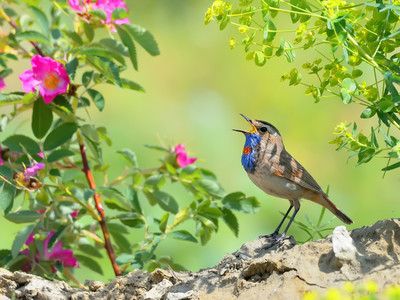 Луговые песни Сама варакушка — красивая птичка. Спинка у неё бурая, зато горло и грудь — ярко-синие с белым или красным пятнышком. Только нелегко рассмотреть варакушку: точно мышь, быстро шмыгает она между ветвей, под нависшей травой. Лишь хвостом из стороны в сторону поводит. Варакушка строит гнездо на земле, искусно пряча его в сухой траве, а птенцов, как многие птицы, выкармливает насекомыми. |