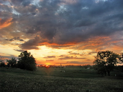 Поле,деревья,солнце,облака