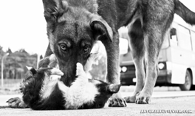 Взгляд только посмотрите, какой глубокий взгляд у этого бездомного пса! Граница, разделительная полоса , вокруг ездят машины и автобусы, а она играет со своим ребёнком и смотрит в глаза ползающему рядом фотографу… |