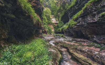 Сухая балка... Апшеронский район Краснодарского края, окрестности Гуамки, ручей и каньон под названием Сухая балка. Кто-то когда-то сильно поиронизировал, дав такое название этому месту. Именно вода, а точнее обилие водопадов в теснинах делают эти места достаточно труднопроходимыми. Упершись в очередную стенку с водопадом, замыкающую скальный коридор, приходится откатываться назад, карабкаться вверх по скальникам и искать обходные пути через дебри на крутых слонах. Местами на прохождение каких-то 500-600 метров пути уходила пара-тройка часов. Зачастую русло принимает вид таких вот коридоров. Кто-то из туристов назвал эти места Нарнией - уж больно необычные и неправдоподобно красивые уголки таит в себе этот каньон. |
