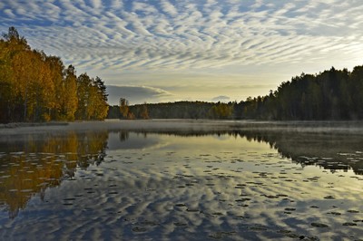 Тишина и гладь воды, хотя от перистых облаков, отражение создает вречатление ряби!