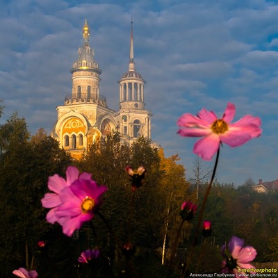 Свет прекрасный, небо волшебное. Красота в простом-- нежность космеи и величие монастыря.. Очень хорошее фото.