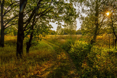 Раннее утро, лучи солнца пронизывают деревья оставляя на траве причудливые тени