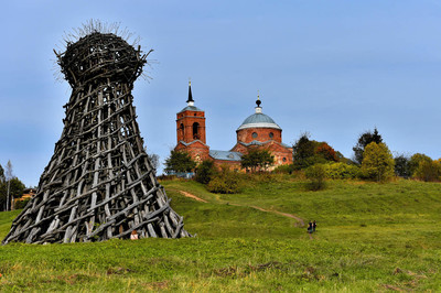 Арт-объект Маяк. Церковь Троицы Живоначальной. Первый долговечный объект Никола-Ленивца 18-метровый «Маяк» на Угре стал символом арт-парка. Он был собран за три месяца без единого гвоздя. и стоит на излучине реки, которая здесь изгибается на 90 градусов. Самое сложное в строительстве было подобрать ветви вязов так, чтобы они производили впечатление плетеной конструкции. |
