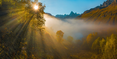 Акварельная осень Веер солнечных лучей в золотистом тумане. Домбай, долина реки Гоначхир. Сквозь густой туман, внизу, просматривается озеро Туманлы-Кёль. Тебердинский природный биосферный заповедник. Начало октября, 2020 год. Фотопроект «Кавказ без границ». |