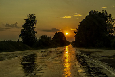 Вечер, прошел дождик, низкое солнце освещает дорогу